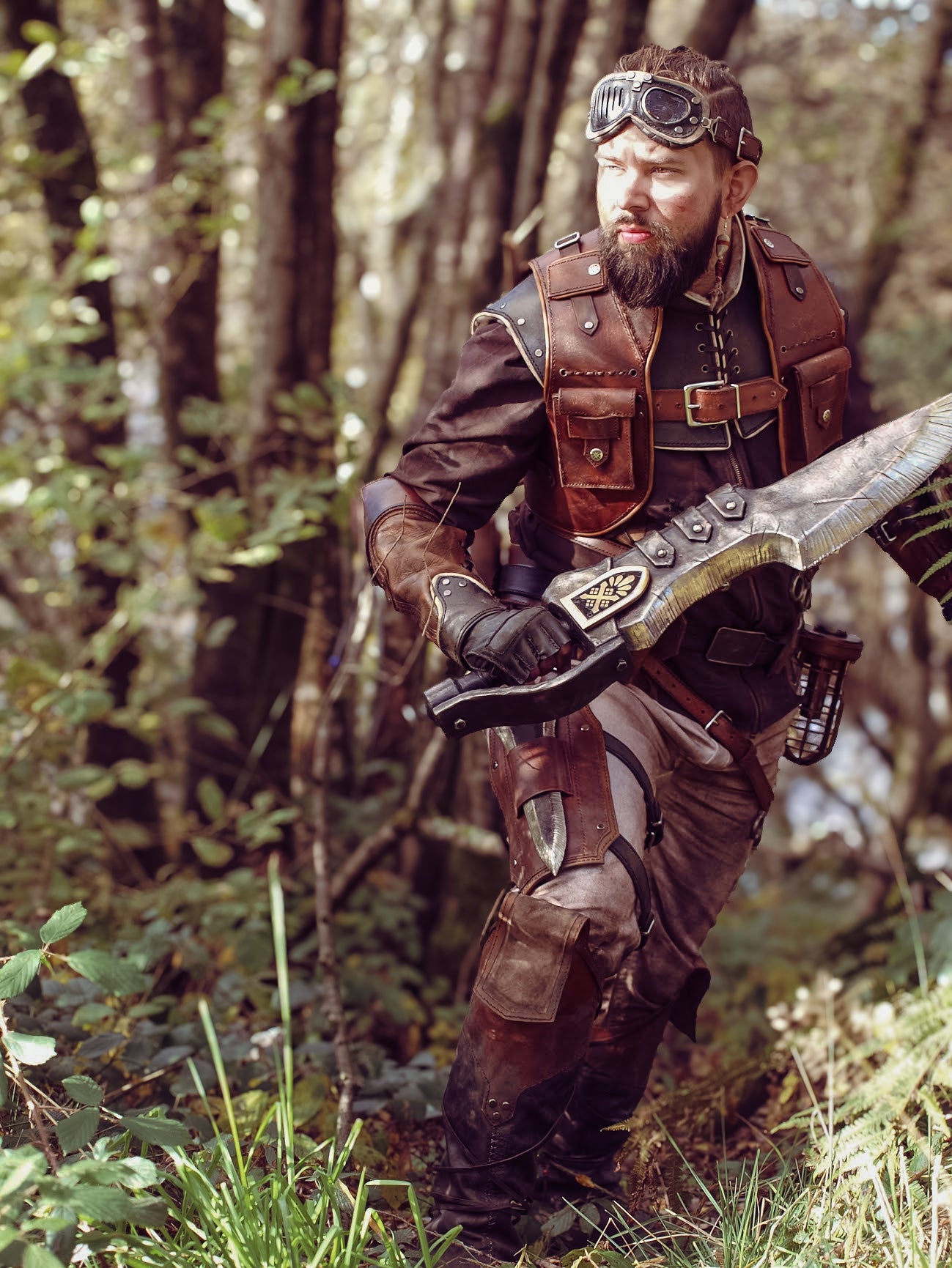 The costume itself is constructed from a variety of leather types and tanning methods. Theres a variety of metals used to build it ranging from tin, 24ct gold, silver, nickel, pewter, and many more. Foam and worbla were implemented selectively, but are covered with authentic materials and used more as a bulking agent to keep props safe for conventions and international transportation.
