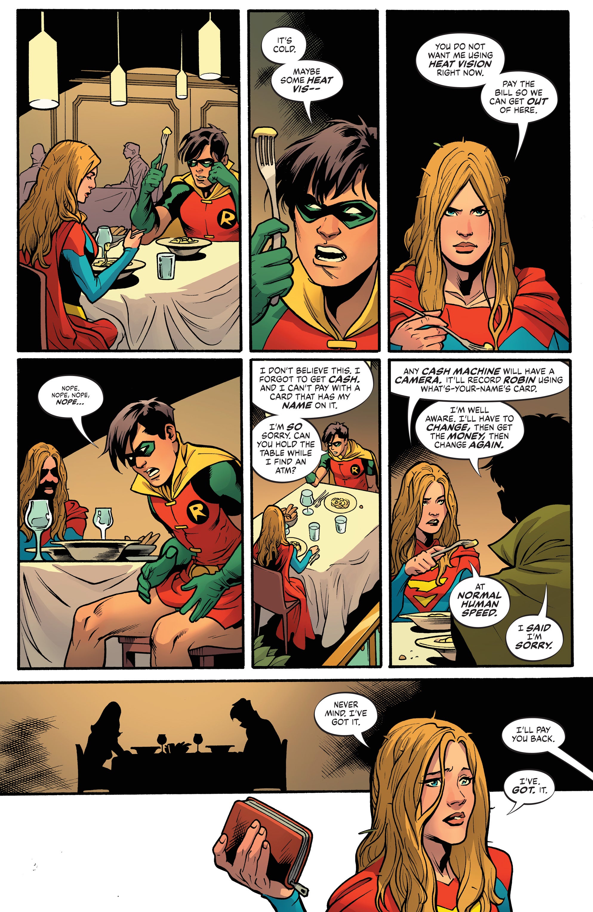 World’s Finest #12 finally unveils this date in full, including the revelation that it was Supergirl who asked out Robin in the first place. While the two were defending Boston from a swarm of Man-Bats, Kara was visibly impressed by how well Robin carried himself during the incident despite not possessing any superpowers. Both Superman and Batman encouraged their respective proteges to enter this tentative courtship. That is, before it all falls apart.