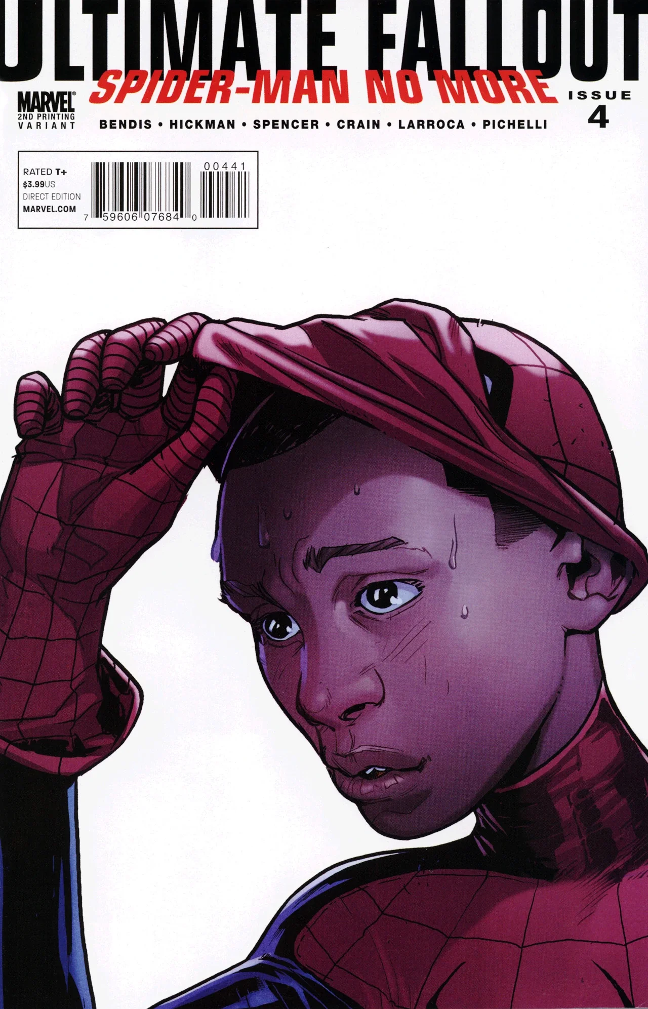 Created in 2011, Miles made his debut in Ultimate Fallout #4, in the aftermath of the recent 'Death of Spider-Man' event in the Ultimate universe. Created by longtime Ultimate Spider-Man writer Brian Michael Bendis and artist Sara Pichelli (with additional input and guidance from Axel Alonso, then-editor-in-chief of Marvel Comics), Miles makes comes out of the gate as a seeming copy of the recently deceased Peter Parker. In his first appearance, Miles wears a Spider-Man Halloween costume — his iconic black and red suit would come later — and clumsily does battle against a D-Tier villain named Kangaroo while the witnessing crowd comments that Miles's attire is in terrible taste.