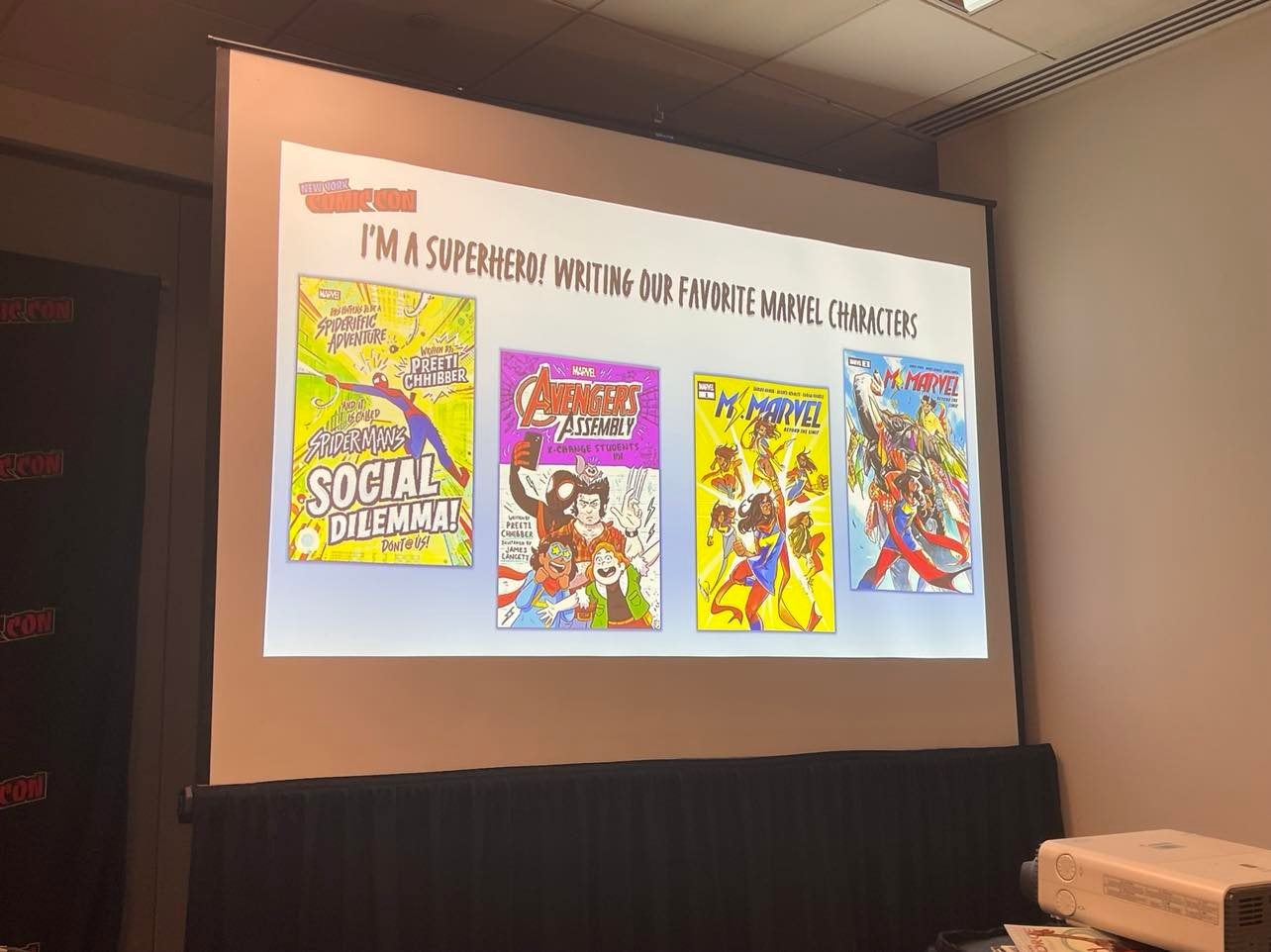 On Saturday, October 8th I attended a New York City Comic-Con panel called I’m a Superhero! Writing Our Favorite Marvel Characters. The panel description said the discussion would feature insights from Marvel authors on their experiences writing for their favorite characters. Beyond that I wasn’t sure what to expect. The panel wound up being so much more, thanks to the energetic discussion, inspiring stories, and deep insights from the speakers. The panel was moderated by Swapna Krishna (author of Sword Stone Table), and featured Samira Ahmed (writer of Ms. Marvel: Beyond the Limit) and Preeti Chhibber (author of Spider-Man’s Social Dilemma).