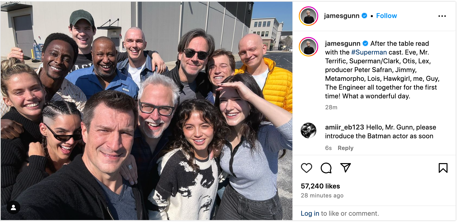 The first cast photo of Superman: Legacy is officially out, regretfully without any spandex, capes, or superbriefs. Still, it was a pretty exciting image, posted today on director James Gunn's Instagram. Along with the photo, Gunn explained that a table read of the film had just wrapped, and listed the character's names in the order their actors were arranged. Check out the post below: