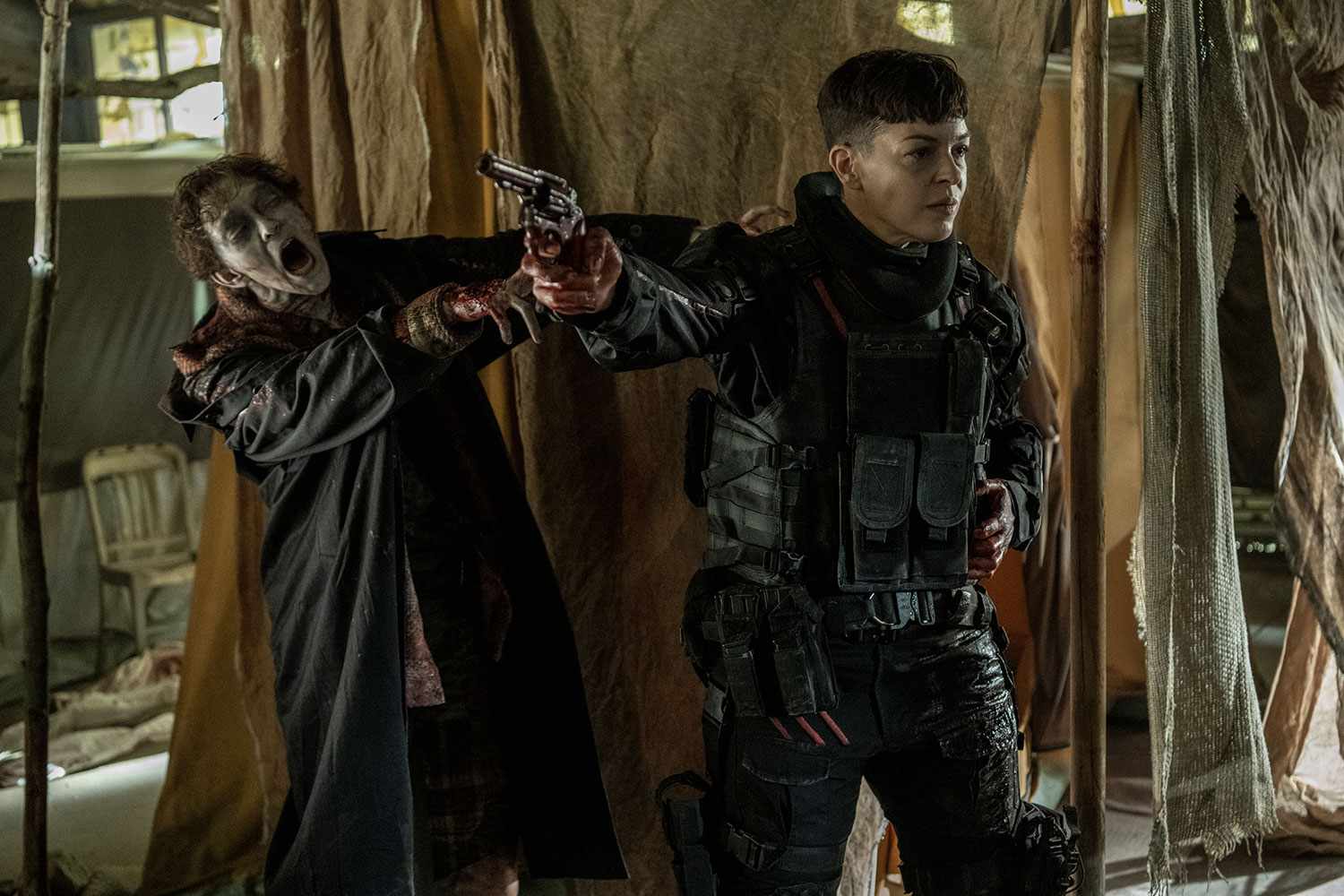 Probably the most devastating deaths in the series, though, involve the two characters that Michonne helped as she left the original series, the pregnant Aiden (Breeda Wool) and her boyfriend Bailey (Andrew Bachelor), plus their sarcastic friend and munitions expert Nat (Matthew August Jeffers), all of whom left their caravan to follow Michonne and then were bombed with chlorine gas after they arrived where Michonne thought Rick was. Aiden and Bailey die from the effects of the gas within a day. Nat and Michonne spent a year in a mall recovering, only for Nat to get killed by a CRM soldier they thought was dead after Nat and Michonne shot the Rick’s plane down.